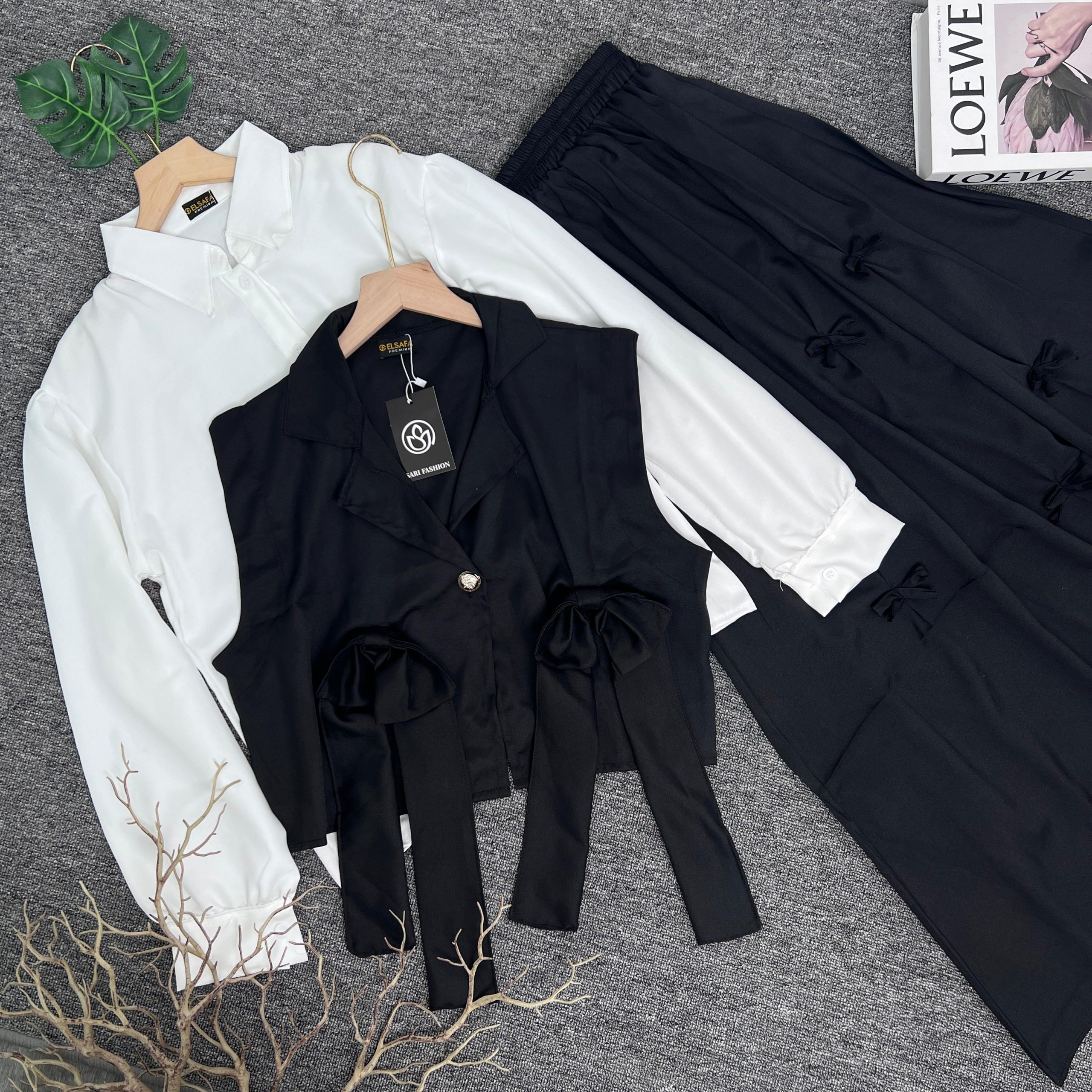 Detail cantik berupa aksen pita pada rok dan vest menambah sentuhan feminin yang membuat tampilan semakin modis dan menawan. Cocok dipakai untuk kegiatan sehari-hari, hangout, hingga acara semi-formal.